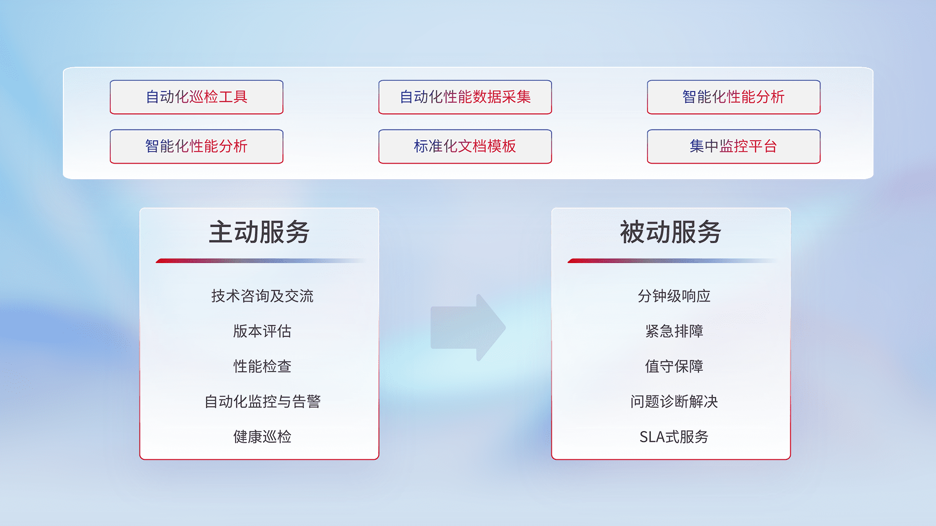 智能化工具和标准化文档,,,,保障服务质量,,提供主动服务(包含技术咨询、、、、版本评估、、、、性能检查、、自动化监控与告警、、、、健康巡检)和被动服务包含(分钟级响应、、、紧急排障、、、、值守保障、、、问题诊断解决、、、SLA服务)。。。。