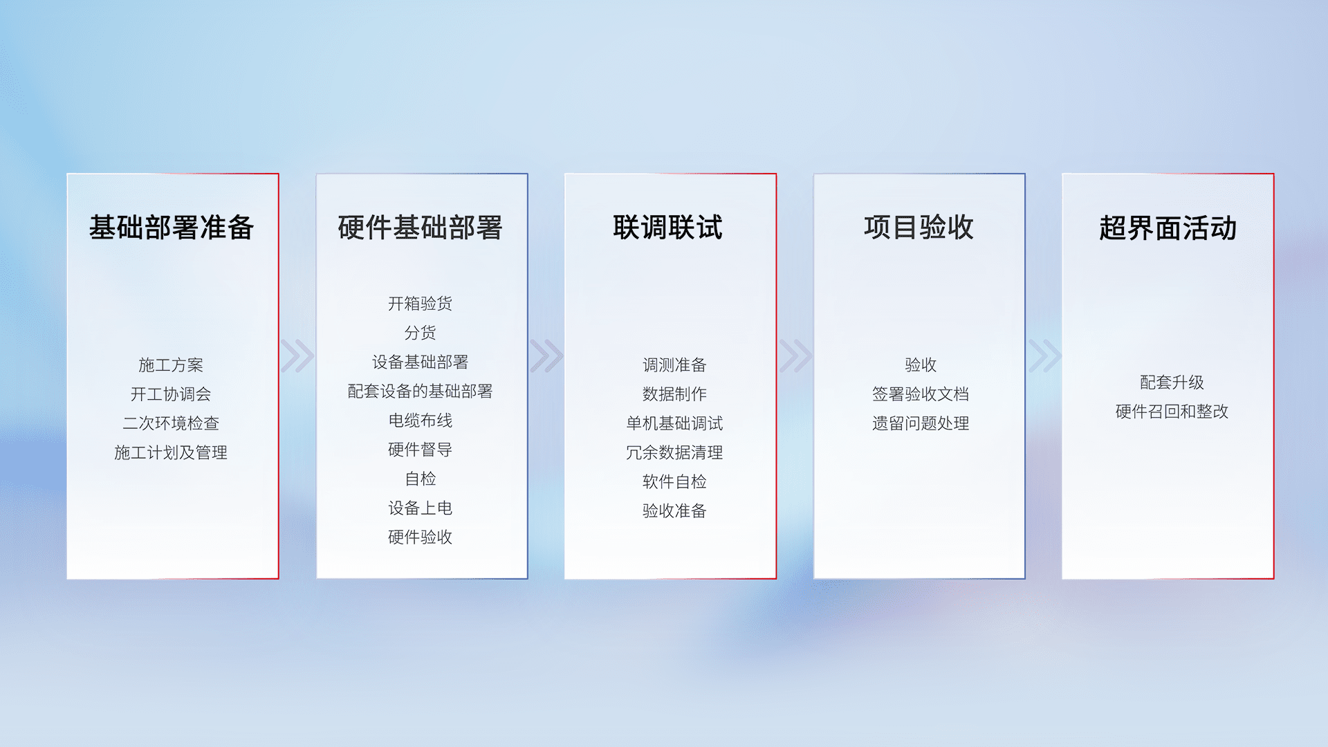 从基础部署准备、、、、硬件基础部署、、联调联试、、、项目验收、、、、越界面活动的全过程可追溯,,,保证施工质量和进度。。。。